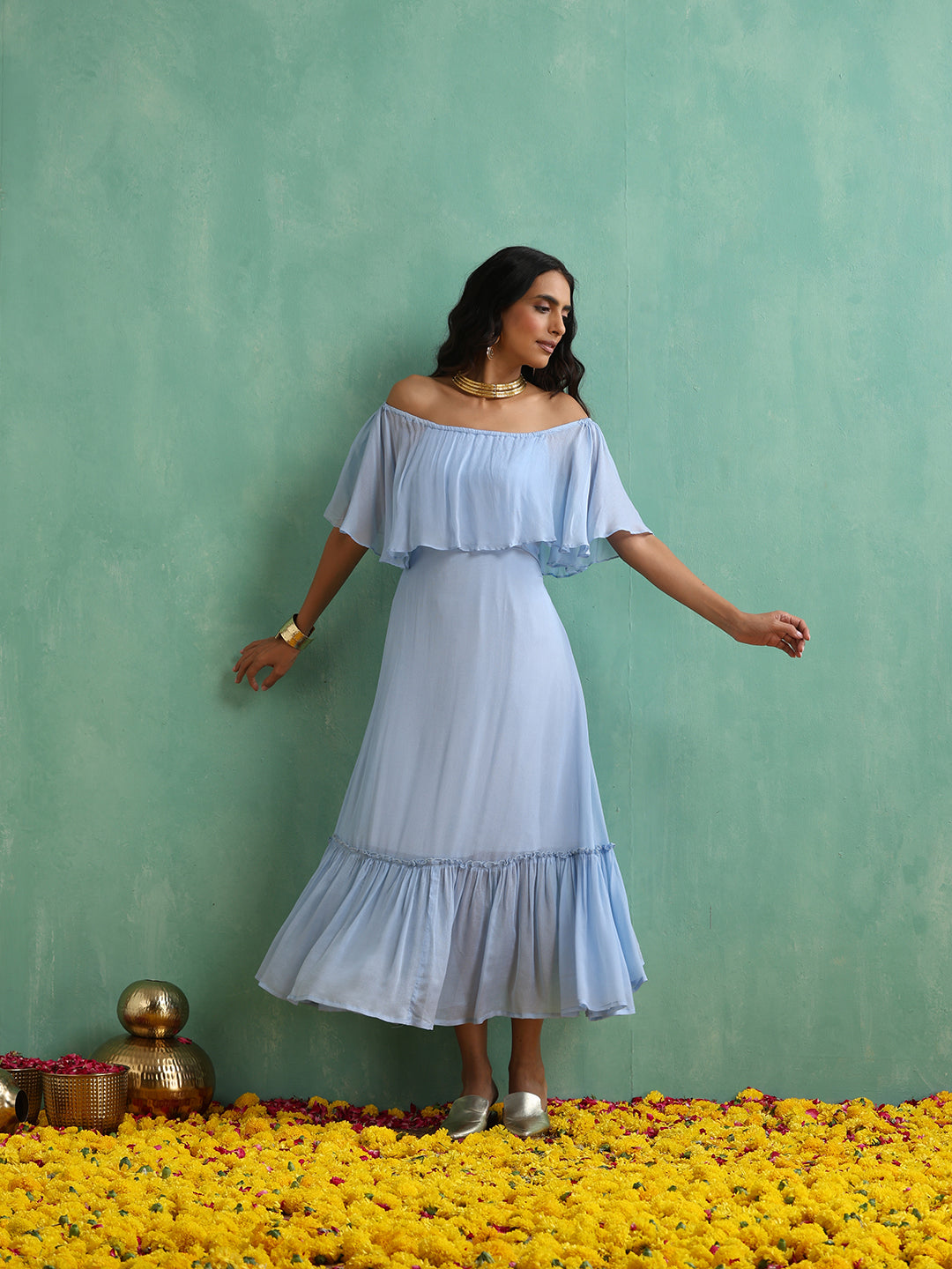 This powder blue chiffon dress features an elegant off-shoulder design complemented by delicate frills. The lightweight, flowing fabric creates graceful movement while the carefully structured neckline offers sophisticated appeal. The subtle powder blue shade provides versatility for various occasions, from daytime events to evening soirées. Expertly tailored to enhance feminine silhouettes while maintaining comfort throughout wear.